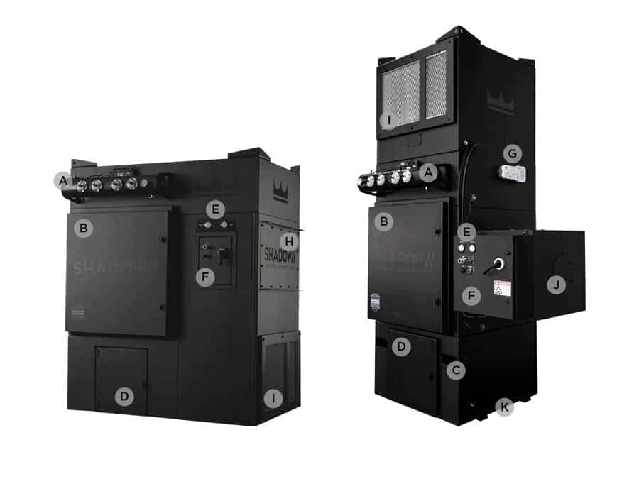 Shadow是专为室内设计的。因此,大多数影子系统将清洁空气,并将其返回设施,因此没有空气排出室外。一个可选的HEPA过滤器可以确保返回设备的空气尽可能干净。